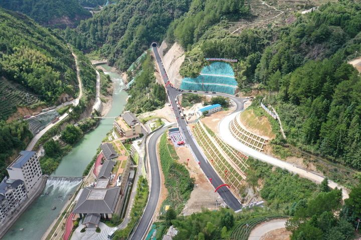 这是2023年8月4日拍摄的福建省道S207线闽浙界至寿宁下党段通车仪式现场(无人机照片)。新华社记者 林善传 摄