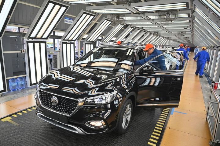 在上汽集团乘用车福建宁德基地总装车间内,工作人员在检查下线车辆(2024年 2月19日摄)。新华社记者 姜克红 摄