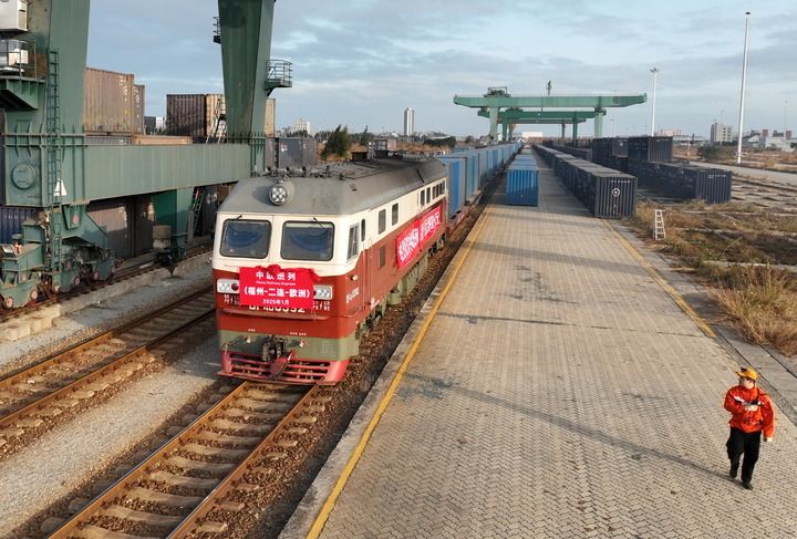 一列满载55个集装箱的中欧班列缓缓驶出福州铁路物流中心江阴港站,这是福建福州2025年开行的首趟中欧班列(无人机照片,2025年1月24日摄)。新华社记者 林善传 摄